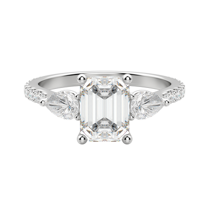 Three stone accented cathedral ring, with a pear stone set on either side of the tapered center setting. Accent stones continuing halfway around the shank.